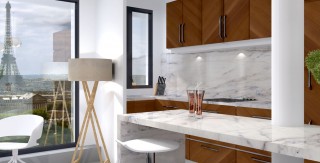 Tiphaine, la propriétaire souhaitait donner de la qualité à son bien locatif. Les matériaux sont retenus pour leur caractère. Les motifs permettent de donner de la dynamique et une échelle aux espaces réduits. Des carrelages aspects carreaux de ciment couvrent la crédence de la cuisine et le sol des toilettes. Un parquet flottant en chêne est disposé dans la pièce de vie et dans la chambre. Une faïence grise effet pierre augmente la sensation de hauteur de la salle de bain. Des éclairages filaires cuivrés créent des ombres et déstructurent les sensations de sous pentes. La cuisine Ikéa s’entoure de panneaux en bois massif pour un rendu soigné et personnalisé.