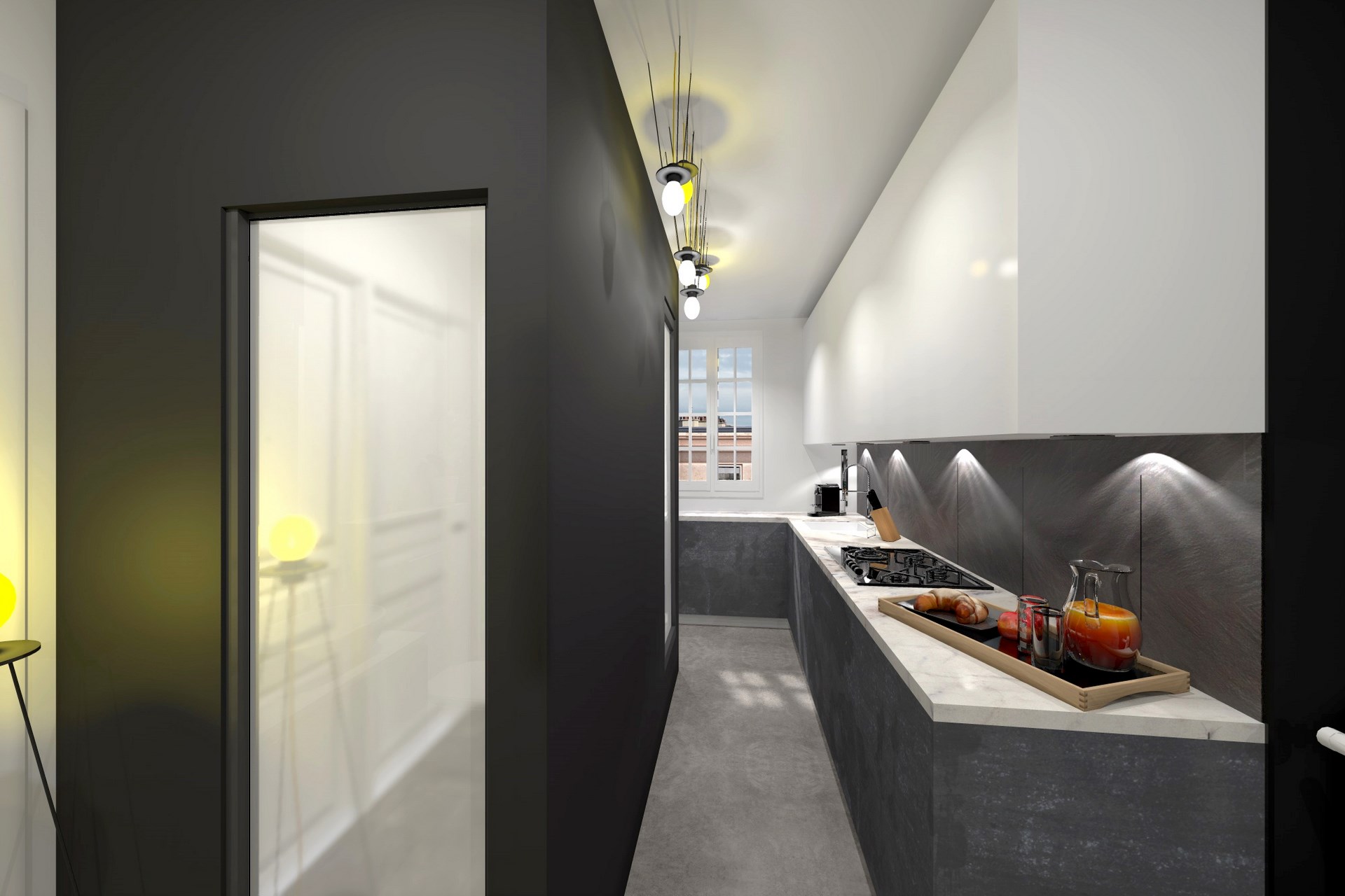 Côté ambiance, l’agence a décliné une variation sur le thème du noir et blanc, avec des jeux de matières : une peinture noire poudrée pour les cloisons, un gré-cérame façon béton au sol, une cuisine habillée de métal, un plan de travail en marbre blanc veiné, de la mosaïque aléatoire en camaïeu de gris clair pour la salle de bain.